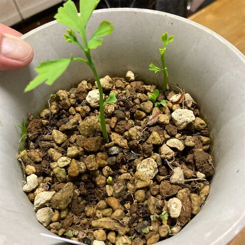 最初に発芽したものもちょっとづつ背を伸ばす。 足元に発芽を発見!! この鉢には12個のギンナンを植えてある 残り9個!!