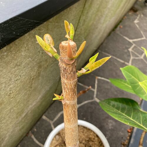 剪定っても1か所ハサミを入れただけ(^O^) 上手くいった。 実家でもやりましょう 挿し木の方もボチボチ行ってます こんな感じで カイガラムシが付いていた葉っぱは黄変し落下 でも芽が葉もとから萌芽 結構タフですね!!(^^)