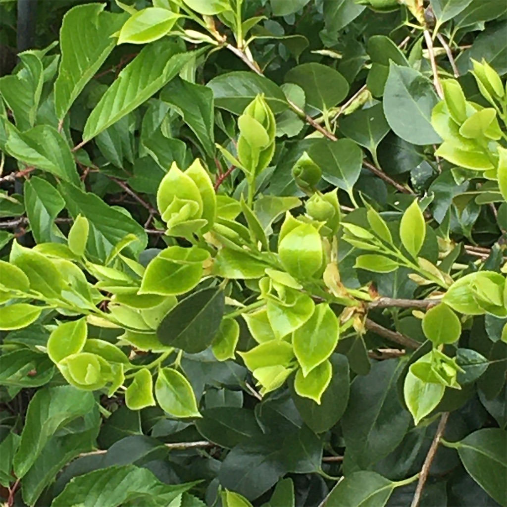 2020-04-18 ツバキ 曙の若葉とフランソワジュランビル ツバキ 曙 バラ バラ2020 フランソワジュランビル 0417 テラスから見下ろすと 曙の若葉が眩しい それに這わしたフランソワジュランビル 曙の成長に合わせて フランソワジュランビルも背丈を伸ばす