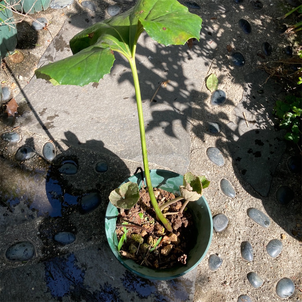 2020-06-02 昨日気がついたツワブキの萌芽 ツワブキ 0602 昨夕に引き続き今朝もアップ なんか嬉しい 元々生命力の強いのは知っていたのだが こんなにも早くたくさん葉を出すのはビックリ テリテリの葉っぱは目隠しにもなるのでこれくらいのポットで増産したいな(^^) もう一回り小さくてもいいかな。